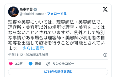 高市首相「特に働く方々にとって、理容室や美容室がお休みの日が勤務先の休暇と重なり、不便を感じておられる方が多いのではないかという問題意識があり、厚生労働省に改善を求めていました」
